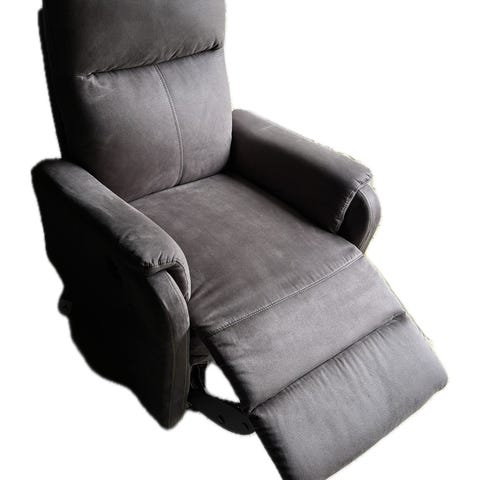 Grå polstret lænestol med indbygget fodstøtte. Stolen har et justerbart ryglæn og fodstøtte funktion, der kan aktiveres elektrisk via en knap på siden. Egnet til afslapning i stuen eller lignende opholdsrum.