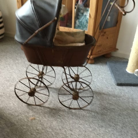 Flot gammel dukke, kan vræle i rigtig god stand og dukkervogn. God stand men rusten stel.
