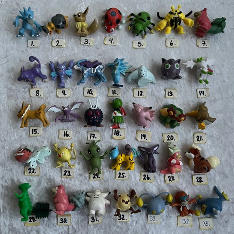 Pokemon figurer der alle er mærket Tomy - men også kan være mærket: Nintendo - Pokemon - China - CGTSJ - Audley - Auldey eller et japansk tegn. Nogen af dem har også brugsspor da de er gamle og har været leget med. Jeg kan ikke tage billeder af alle enkeltvis, -men er der nogen du er interesseret i - så kan jeg tage nærbillede af dem, så du kan se stemplet og standen på dem. Frit valg pr stk 75kr. Ishøj.