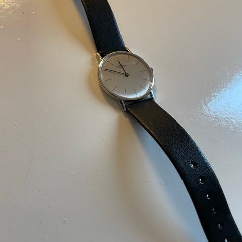 I sandblæst rustfrit stål med ultra-tynd schweizisk automatisk værk, hvid skive med sorte indekser, ridsefast konveks safirkrystal og rustfri stålarmbånd