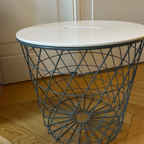 Flot og funktionelt KVISTBRO bord fra IKEA i hvid. Bordet fungerer både som sofabord og opbevaringsløsning, da den runde metalbund kan bruges som kurv til tæpper, puder, magasiner m.m. Aftagelig bordplade i træ med greb gør det nemt at komme til indholdet.