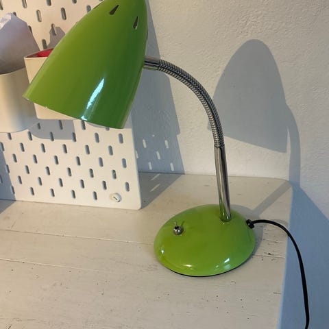 IKEA skrivebordslampe i en sart lyserød farve. Lampen har et justerbart armatur og et perforeret lampskjold, som giver et dekorativt lysmønster. Velegnet til brug som skrivebordslampe på børneværelset.