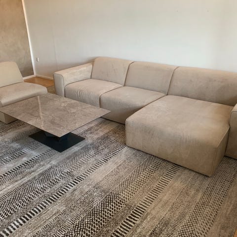 Flot hjørnesofa i beige. Brugt 3 år. Har få brugsmærker (se billeder). Både sofa og tæppe er blevet professionelt renset og fremstår meget vedligeholdt.