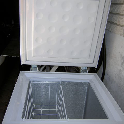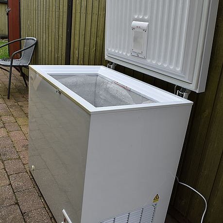 Scandomestic 90-100L kummefryser med hvid overflade. Fryseren har en kapacitet på 90-100 liter og er designet til opbevaring af frosne varer. Enheden har energimærkning og tekniske specifikationer angivet på mærkaten, herunder spænding, strømforbrug og kølemiddeltype. Trænger til rengøring af lister, pris sat derefter!