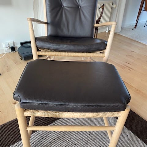 Flot klassiker fra Wegner inklusiv hynder samt nakkepude i brunt læder. Velholdt, bøg med lidt brugsspor (der let kan slibes væk) Priside