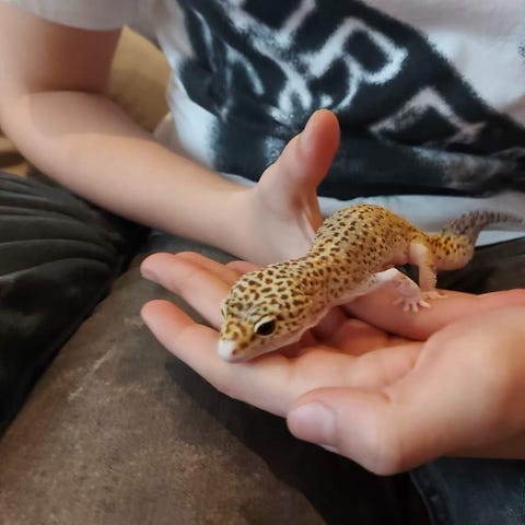 Gekkoerne er lidt over 1 år gamle, en han og en hun. Hannen er meget nysgerrig og legesyg - sidder gerne på skødet eller går på opdagelse. Hunnen mere sky men kan fx håndfodres.