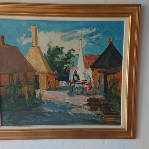 Oliemaleri, Svend Nielsen, motiv: Landskab, stil: Modernisme, b: 95 h: 65, Svend Nielsen, motiv fra Allinge, Allinge gasværk,