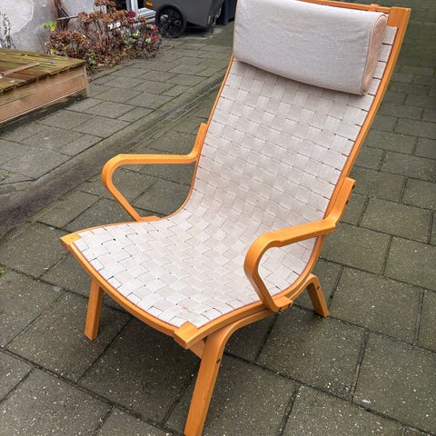 Original Albert stol lav, dansk produceret loungestol i massivt lyst træ med sæde og ryg i naturgjorde / vævet webbing.