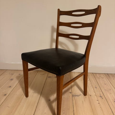 Seks flotte spisebordsstole i klassisk design. Masive ben og stivere. Sæde og ryg i formspændt flerlags egefiner. Sædemål 48,5x40. Ryglænsbreddet: 50,5. Højde på ryglæn fra gulv 77. Sædehøjde 46,5 og Dybde: 46.