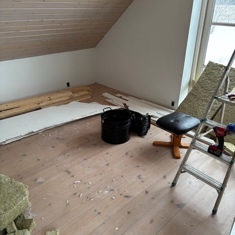 Så der er 35,64m2 i hele planker og rummet de har lagt i er 47 m2 så i tilskårede planker er der omkring 15-20m2