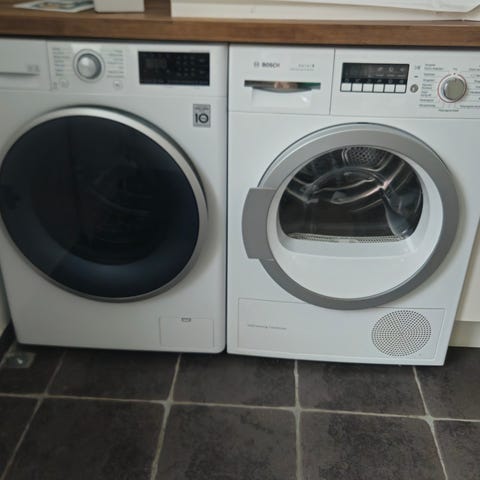 Nyere vaskemaskine + ældre tørretumbler af mærket wasco. Vaskemaskine er kun brugt af enlig, som i lange perioder, ikke har været hjemme, så derfor ikke brugt meget.