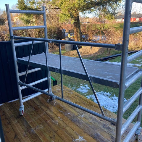 Foldestillads, Jumbo, Udlejes på dagsbasis dog mindst 3 dage: Fleksibelt og robust rullestillads fra Jumbo med skridsikker platform. Leveres komplet med platform og 125mm slidstærke og skridsikre hjul. Jumbo Foldestillads kan let foldes sammen - hvilket gør flytning, opstilling og nedtagning enkelt. Stilladset fylder minimalt i sammenfoldet tilstand. Mål: 178 x 74 cm Arbejdshøjde: 3,80 m Ståhøjde: 1,80 m Vægt: 32,0 kg Hjul: Ø12,5 cm med polyurethanbelægning