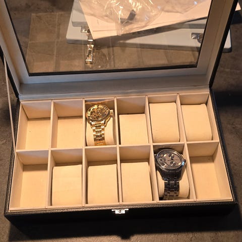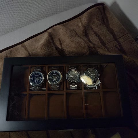 Urboks med 5 herreure af blandet mærker. Standen er rigtig god på alle sammen. De har dog stået i kassen og brugt batteriet. Så der skal nyt batter i. Led og værktøj er med.