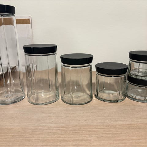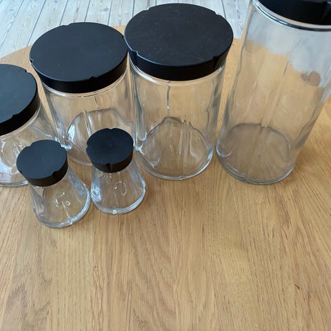 Rosendahl opbevaringsglas med sorte låg i forskellige størrelser. Glasbeholderne er gennemsigtige og har tætsluttende sorte låg, der sikrer opbevaring af forskellige madvarer eller småting. Sættet indeholder flere glas, som kan anvendes i køkkenet til opbevaring af krydderier, tørvarer eller lignende.