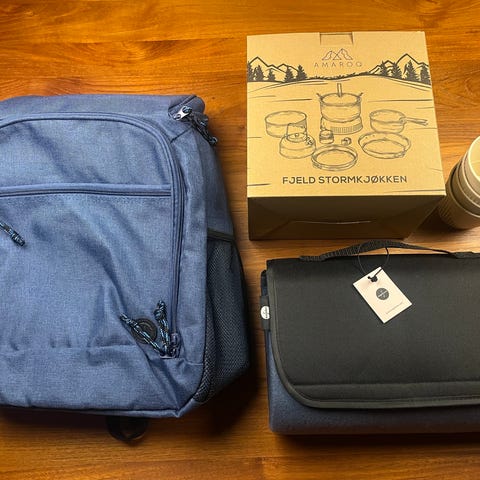 Sæt med rygsæk, isoleret tæppe, stormkøkken og kopper - HELT NYT