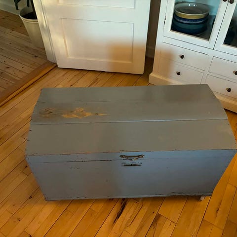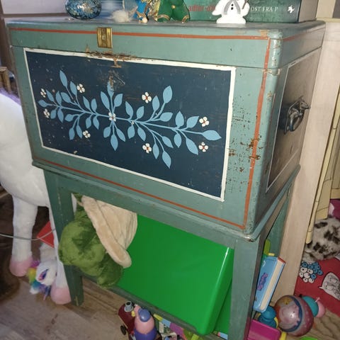 Rummelig kiste med fladt låg, så den kan bruges som bord.