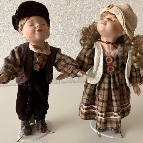 Gammel porcelænsdukke - vintage - retro. Dukken er 75 år og i meget fin stand. 48 cm. Håret, som er menneskehår, er blevet lidt tyndt. Den ene arm er lidt slap, men sidder fint. Kjolen er syet af min mormor, som var født i 1890. Kr. 225,-