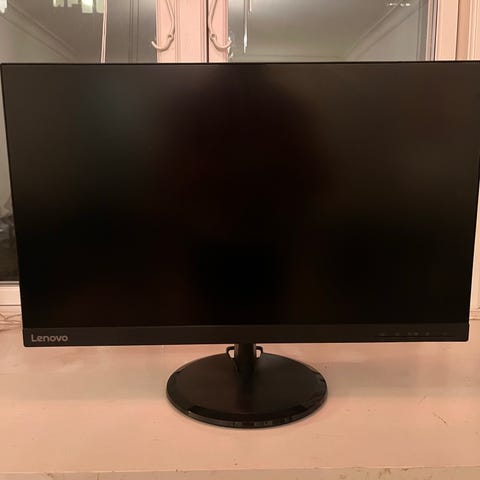 Lenovo 27 tommer skærm. Skærmen har en størrelse på 27 tommer og er designet til generel brug.