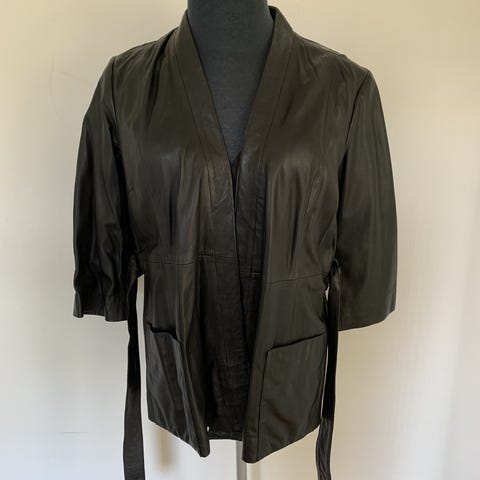 ONLY Læder Jakke i grøn farve, størrelse S. Jakken er lavet af læder og er designet til kvinder. Den har en kort pasform med bælte og lynlåse som detaljer.