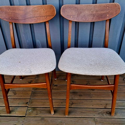 Super smukke vintage teaktræ spisebordsstole med lækker patina. De kunne sagtens bruge en let slibning og oliering, eller man kan beholde den fine patina. 😊