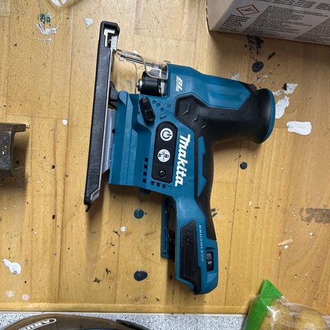 Makita JR001G stiksav og HR002G borehammer med 40V batteri. Inkluderer batterioplader og batteri. Værktøjet er egnet til forskellige skære- og boreopgaver.