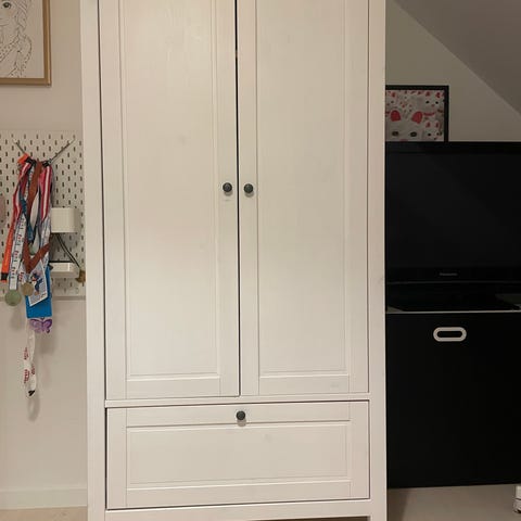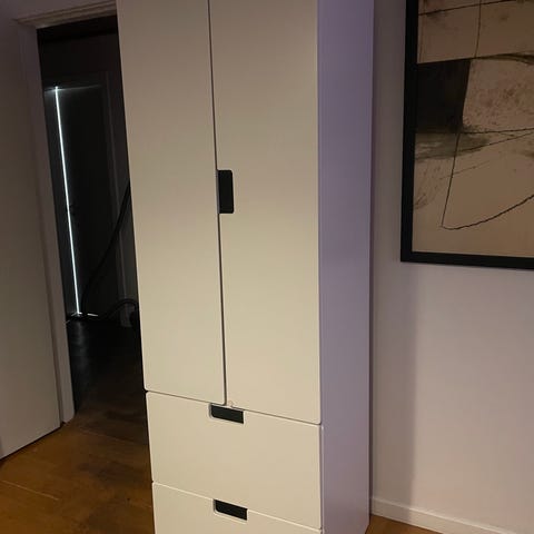 Garderobe med 4 skuffer, 2 grøn og 2 hvid. Hvid skabsdør. Er skilt ad.
