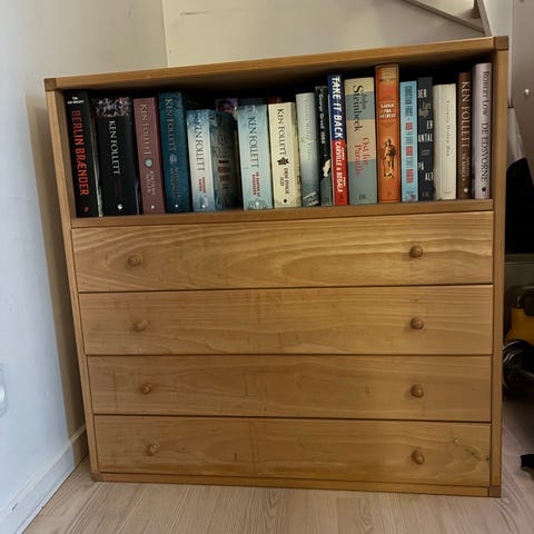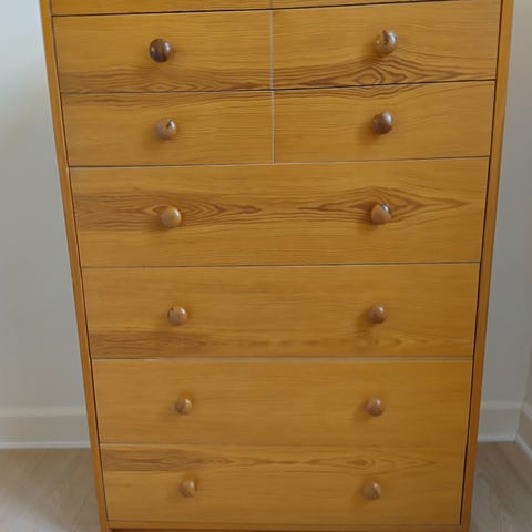 Slank kommode produceret af Haslev Møbelsnedker i lyst solidt træ. Sælges alene eller sammen med bred fireskuffers kommode.