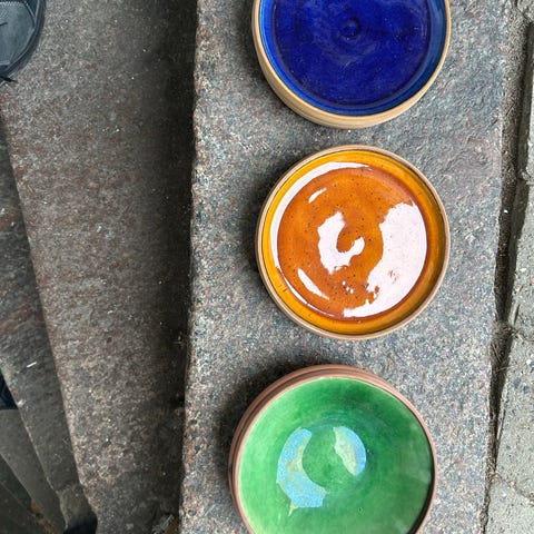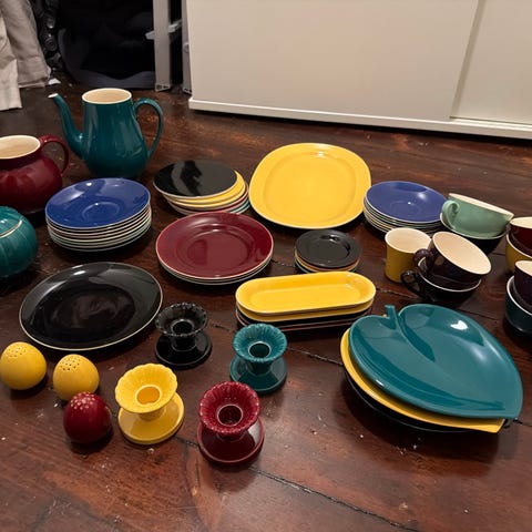Sæt af porcelæn kopper og kander med guldkant. Kopperne er i forskellige farver, herunder sort, blå, grøn og vinrød. Kanderne er sorte med guldkant. Sættet inkluderer også matchende underkopper i lyse farver. Velegnet til servering af varme drikke.