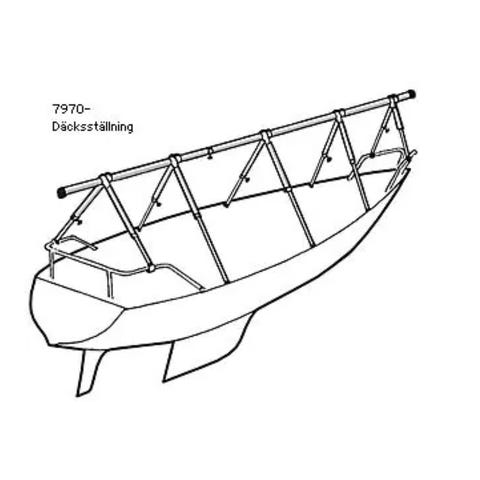 Dækmontret med udligger, som holder presenningen væk fra skroget for mindre slid og mere luftspalte for bedre ventilation. Teleskopiske ben giver højdejustering og sideforskydning for præcis pasform. Forankring i pulpit, pushpit og ræling giver stabilitet i hårdt vejr. Det hele er samlet i to originale tasker fra NOA