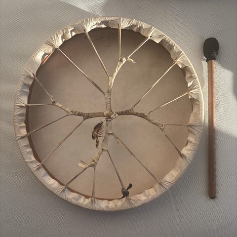 Håndlavet tromme med rundt skind og medfølgende trommestik. Trommen har en naturlig farve og er spændt op med snore på bagsiden. Trommestikken har et blødt hoved, egnet til at spille på trommen.