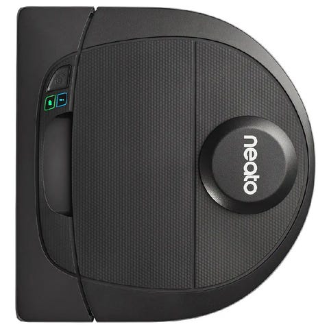 Neato Botvac robotstøvsuger med rund form og sort/sølv farve. Enheden har hjul til bevægelse og en aftagelig støvbeholder. Velegnet til automatiseret rengøring af gulve.