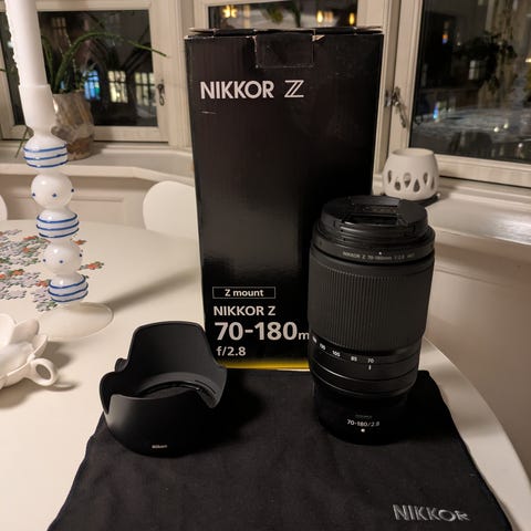 Nikon teleobjektiv med stativbeslag og bæretaske.