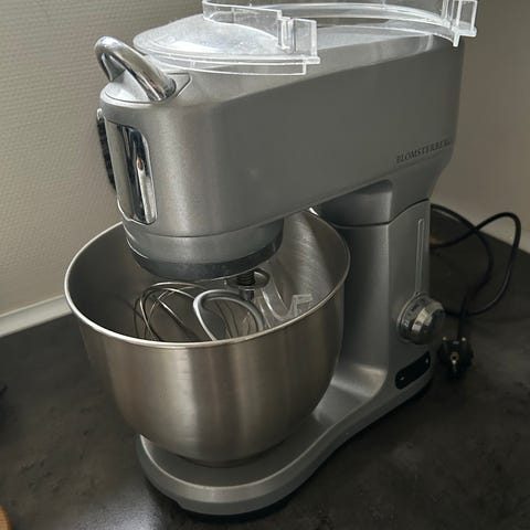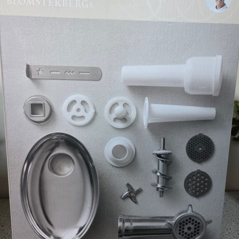 Blomsterbergs køkkenmaskine med tilhørende rustfri stål skål og kødhakker.