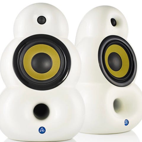 Et sæt aktiv Scandyna Micropod Bluetooth højttalere i hvide med indbygget forstærker.