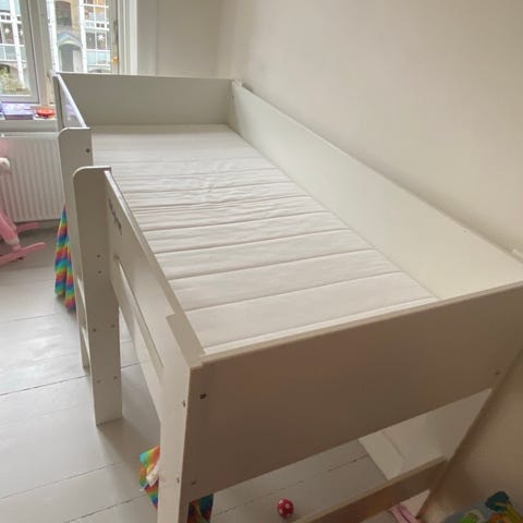 Flexa Juniorseng til børn i hvid. Sengen har en ramme formet som et hus og inkluderer en lille trappe. Den er designet til børn og er lavet i hvidt materiale.