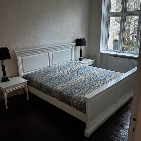 Dobbeltseng i hvid med 2 sengeborde – inkl. madrasser og sengetæppe