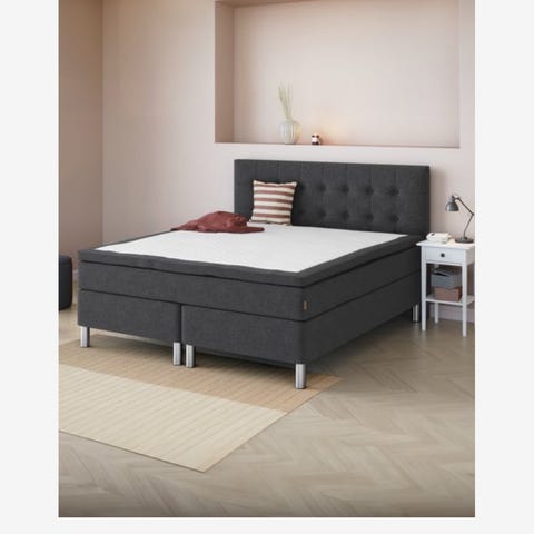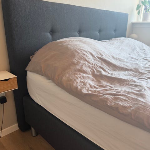 Det er en Jupiter kontinentalseng fra Bedre Nætter. Bemærk at springmadrassen og topmadrassen ikke medfølger da vi bruger det på en ny sengeramme.