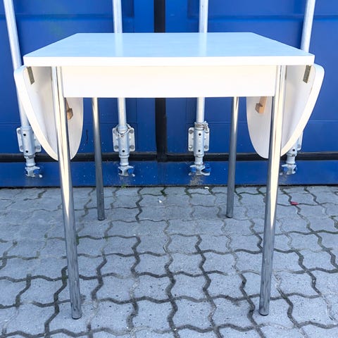 Sjovt retro klapbord / Spisebord med rød Formica bordplade. 60x60 med klappen nede, men bliver 90cm med klap. Benene kan slås sammen så det let kan pakkes helt væk.
