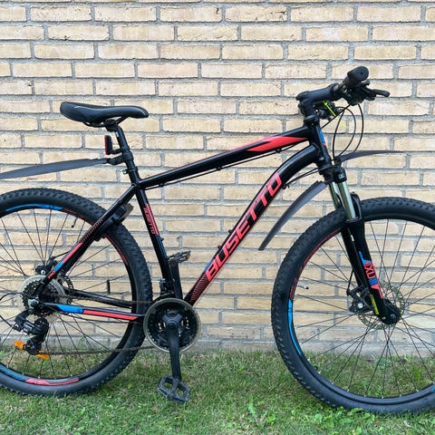 mountainbike i meget fin stand. Den har 27 gear (3x9) og skivebremser for og bag. Skærme for og bag, samt lås. Den er hvid med grønne striber. Meget fin cykel, har kun en smule rust på affjedring i for.