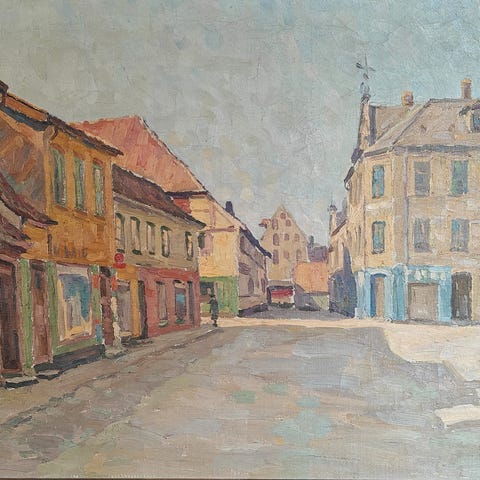 Smukt og stemningsfuldt originalmaleri af Carl Johannes Jensen, der viser et intimt byparti fra Odense med udsigt til Sankt Knuds Kirke. Malet i 1931 og signeret CJ, hvilket placerer værket i kunstnerens modne periode.