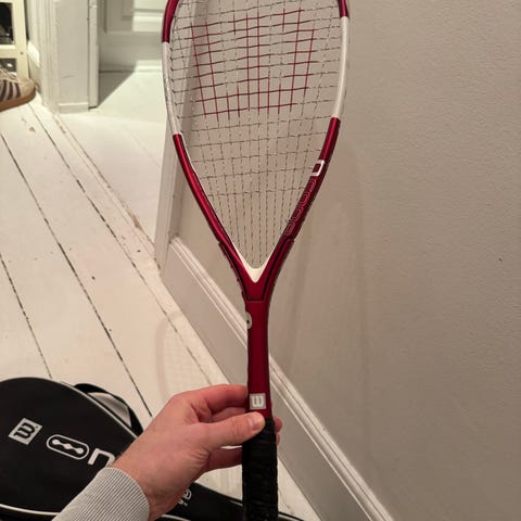 Wilson Blade Comp squashketcher med cover. Ketcheren har et sort og gult design og er egnet til squashspil.