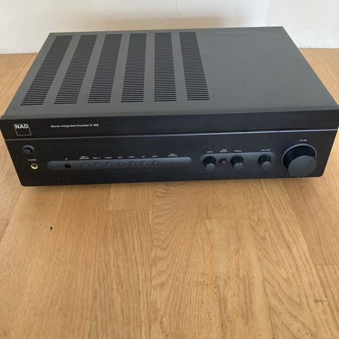 NAD C 316BEE stereo integreret forstærker med flere inputmuligheder inklusive hovedtelefonudgang, tuner, AUX, video og CD. Enheden har kontrolknapper til lydstyrke og balance samt en fjernbetjening.