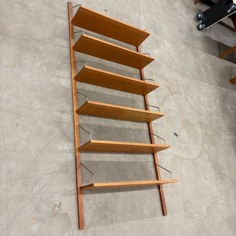 Jeg søger hylder i teak med stænger til at sætte på vanger. Vangerne har jeg. Jeg søger hylder der er 82 cm lang. Det normale er 80 cm men JEG SØGER HYLDER PÅ 82 CM OG TILHØRENDE STÆNGER