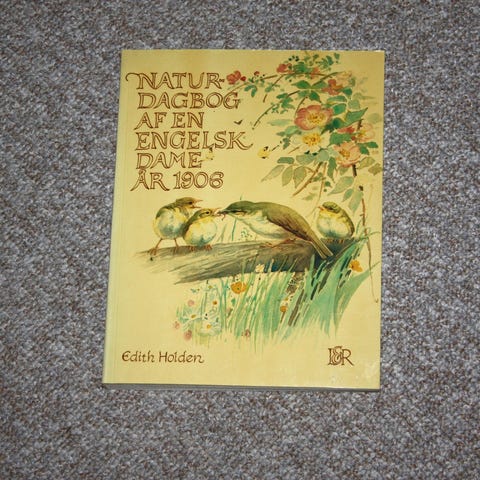 Edith Holden Naturbilleder af en engelsk dame bog med illustrationer af natur, dyr og planter. Indeholder detaljerede akvareller og tekster om naturens elementer og dyreliv.