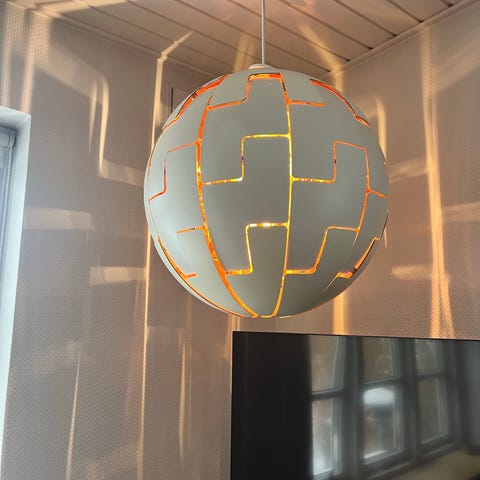 Dette er en IKEA PS 2014 lampe. Den er hvid og sølvfarvet og har ingen brugsspor. Formen og lysintensitet kan ændres ved at trække i snorene i bunden.