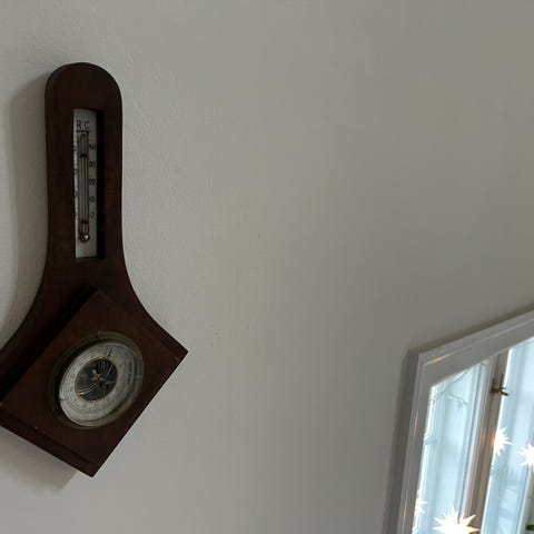 Termometer, Termostat i træ med kobber skive. ligner en vikingeborg. står Monaco på længde: 21 cm bredde 11 cm.