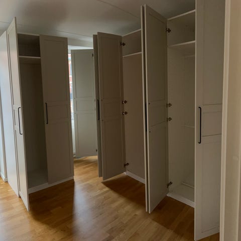 Vi sælger vores to ikea pax skabe på 150 cm bredde, 236 cm høje og 58 dybe.