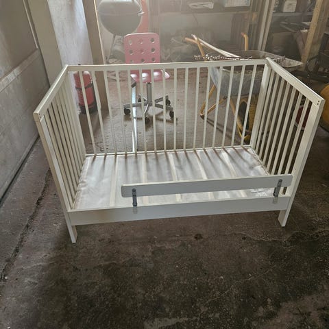 Tremmeseng i ubehandlet træ, med madras, rullemadras og tre lagner (to i mousselin), sengeranden fra CamCam med hav-tema medfølger.
