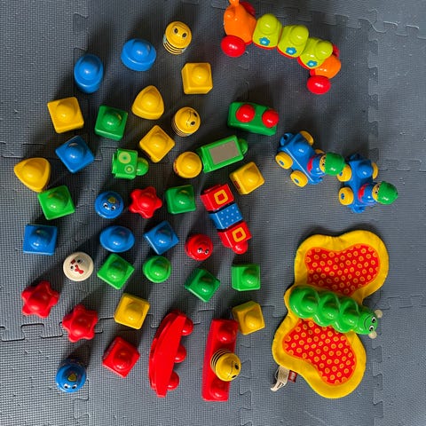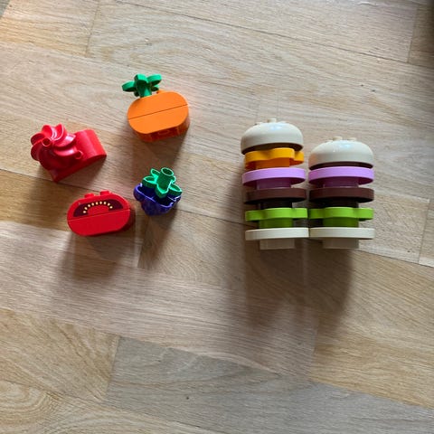 LEGO DUPLO Andet legetøj med forskellige farverige byggeelementer, herunder stablebare runde blokke og frugtformede klodser. Velegnet til små børn til udvikling af motoriske færdigheder og kreativ leg.