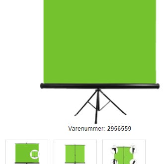 Polyester1.6 m x 1.57 m, chroma-key grøn. På stativ så højde og "lavde" kan justeres. Nyprisen er omkring 550,- Stort set ikke brugt.